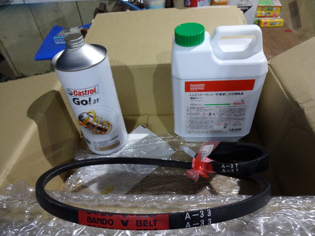 午後便でMonotaRoで注文してたVベルトと緑色のクーラント、スクーター用の2stオイルが届いたので、仕事が終わってから保管場所に持って来ました。