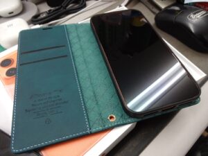そしていつもの手帳型カバーです。ほぼフルカバーになるので、正直ボディーカラーはどうでも良かった気がします。