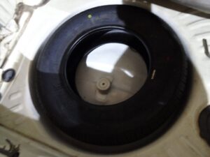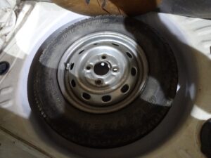 スペア用のタイヤは購入済みなので、試しに合わせてみたらきちんと収まりそうな感じです。このクルマが売られてた当時、スペアタイヤはテンパータイヤでは無く、純正装着と同じタイヤが積まれてました。