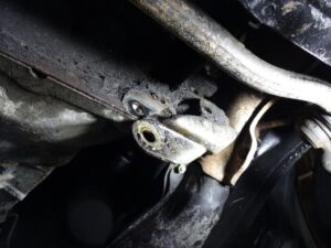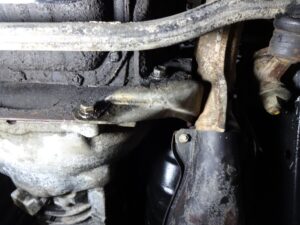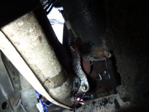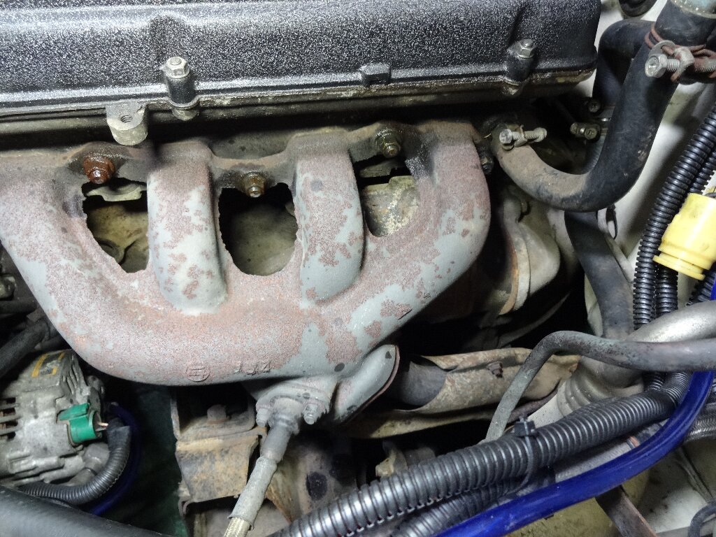 ソノママでは遊びが無くエキマニが抜けて来ないので、フロントパイプとミッションを締結するマウント部分のボルトを外すと、
