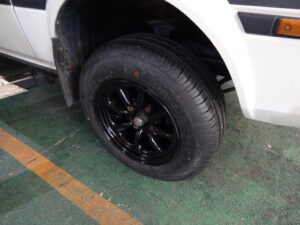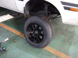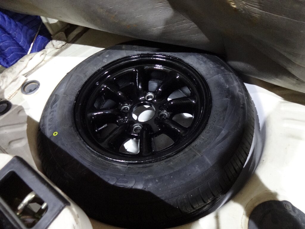 先日ホイールの塗装してタイヤを組み付けたスペアタイヤですが、一度も試着してなかったのでついでに試着しておきます。肝心使おうと思った時にきちんと嵌らないと困りますからね。