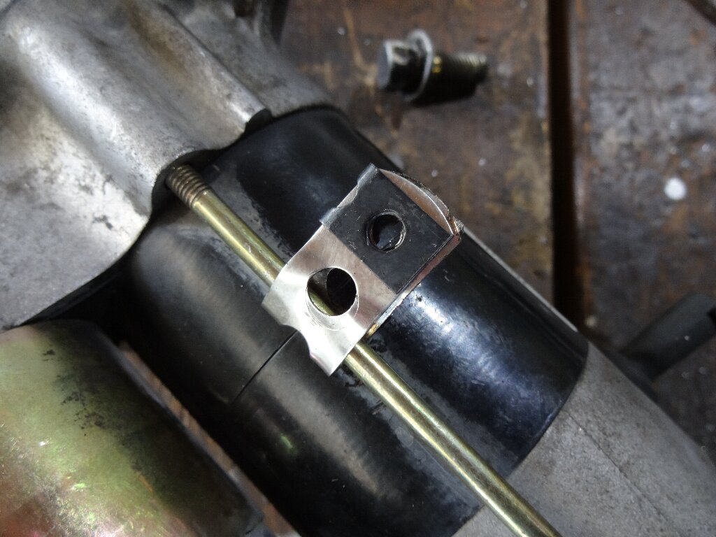 純正のセルに付いてた遮熱板をどうにか取り付け出来ないか?と思案して、エーモンステーの切れ端使って留めてみます。