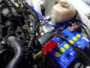 件の6600Vのケーブルの片側丸端子はバッテリーの端子に挟み込むので先端部分のみ飛ばしてしまい、スイッチ用の配線と一緒に純正ケーブルに被せてあった配線カバーを通しました。