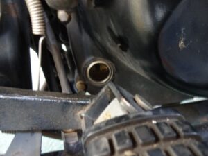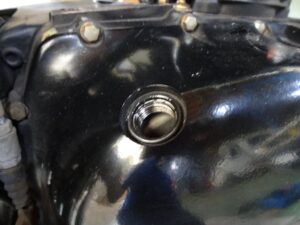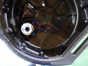 オイル注入口はコインドライバーで回す頭がフラットなボルトでした。しかし注入口開けてもオイルはチョロチョロ、、、