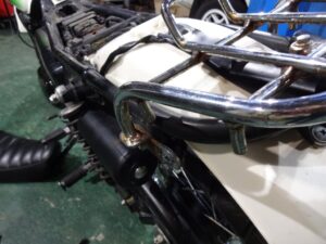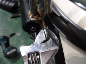 まずは転倒して曲げたであろう左後ろのウィンカーステーの修正から。
