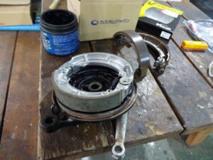 今日は雨模様で吸湿性の高いブレーキフルードは触りたくないので、リアブレーキシューの交換する事にします。