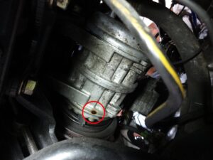 リフトから下ろして上から覗くと、やはりカムチェーンテンショナーの周りがオイリーです。縦目ベンツもそうでしたが、コノ形状のテンショナーは漏れ易い印象です。