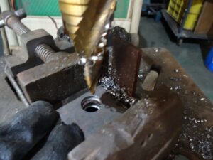 フラットバーに下穴あけてから、ステップドリルで穴を拡大します。右後ろなので少しオフセットした位置に穴あけました。