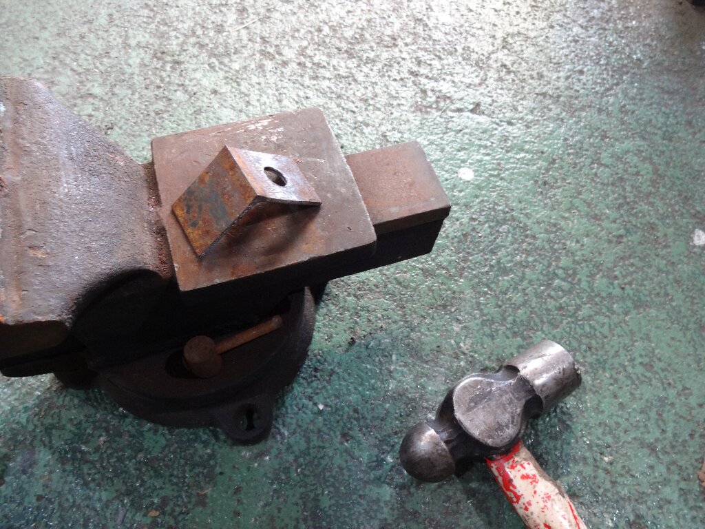フラットバーにサンダーで筋掘り入れてコの字に曲げて、左後ろのマウントを作成します。