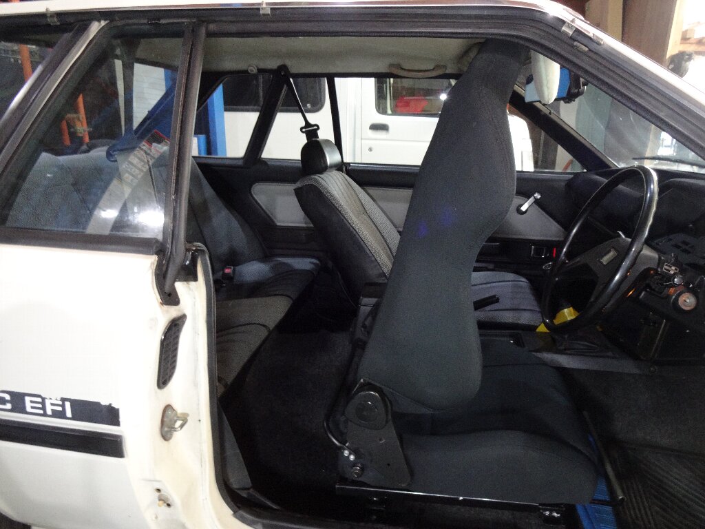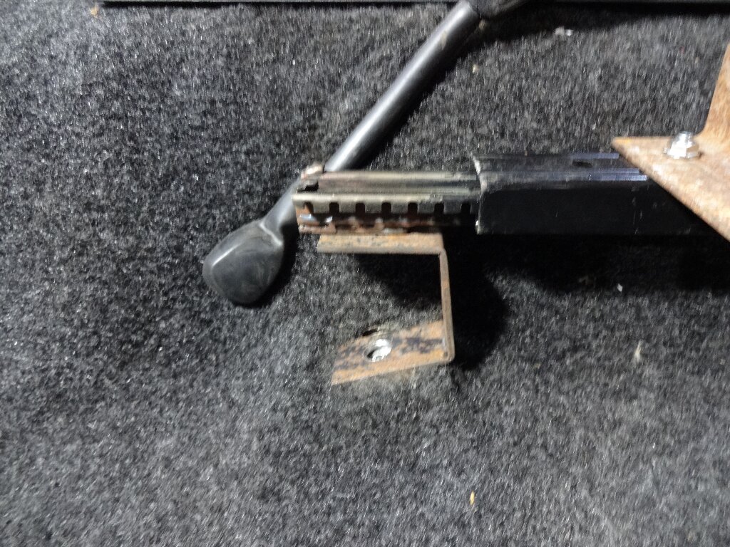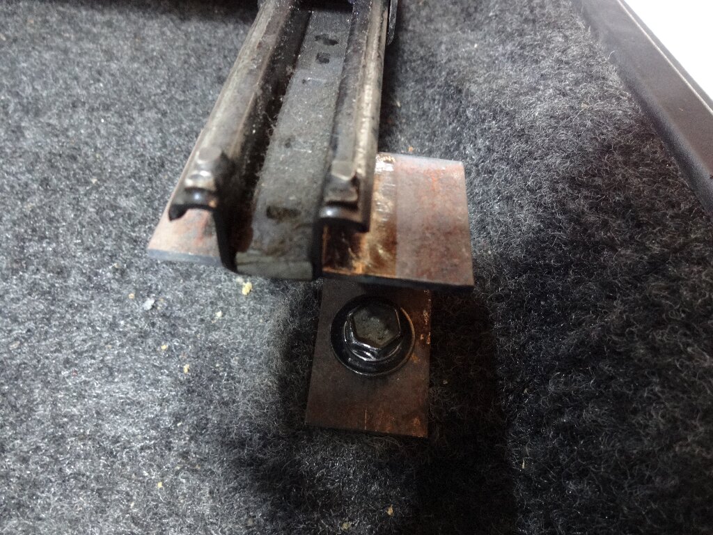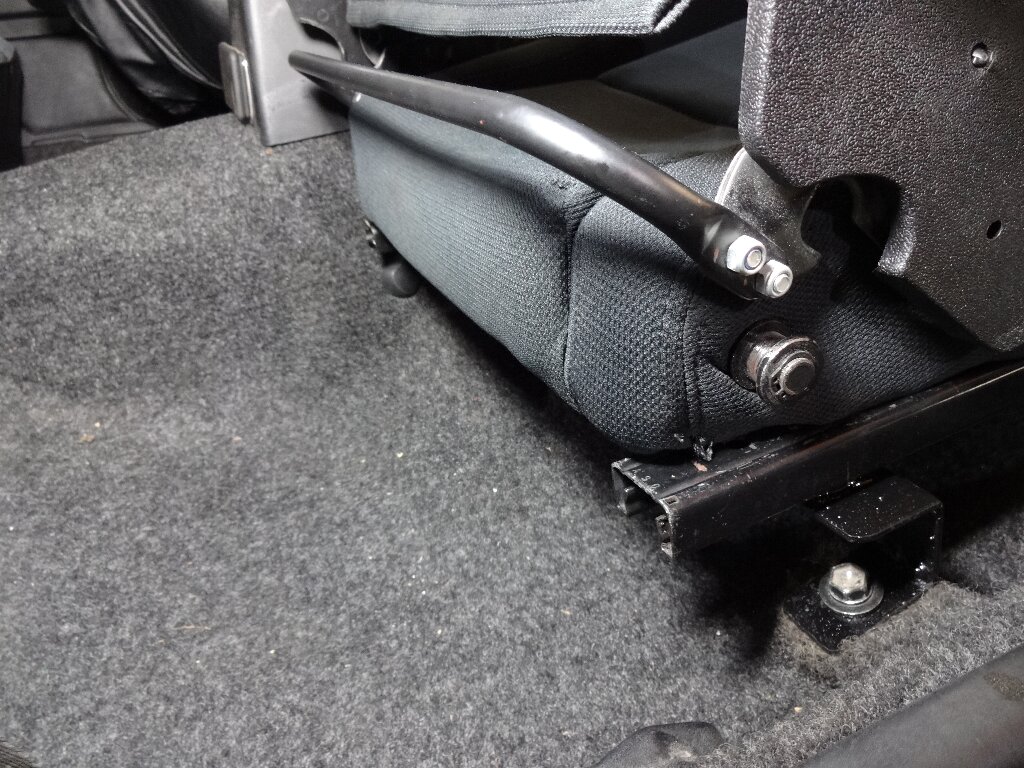 コレ以上下げるとなると、後ろ側のマウントをもう少し低くするぐらいか?となると、一杯下げた時にシートレールが床に干渉しそうだし、左側のシートベルキャッチのマウント部分が引っ掛かります。