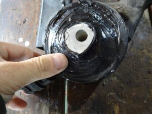 板ゴム詰めて靴底修理の樹脂で固めたエンジンマウントですが、樹脂もほぼ硬化したみたいなので装着します。