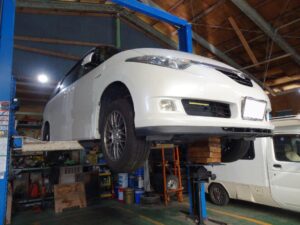 リフトで上げたままのエスティマHVですが、ミッションジャッキはやはり多少下がってエンジンが浮いてました。ま、油圧だけで保持するんで仕方無いですね。