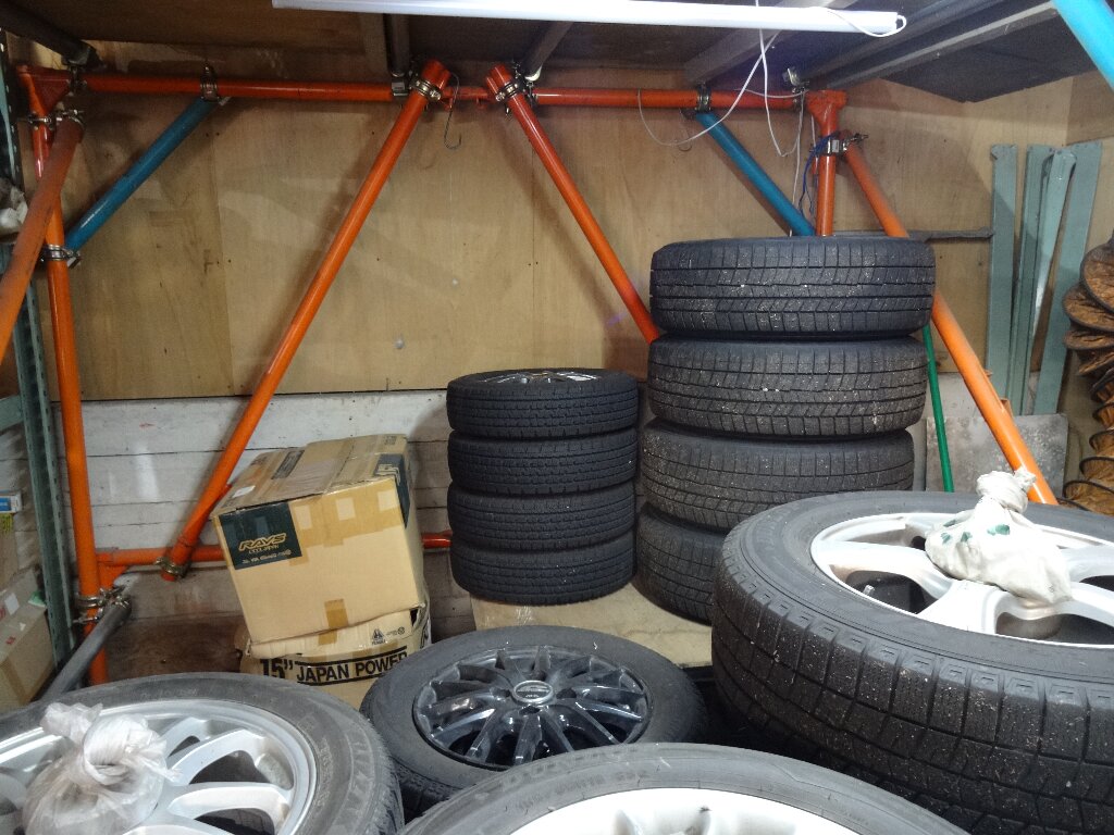 テントむしのスタッドレスは車体買った時に付けてくれたのですが、置いてあるのはエスティマHV用と同じく元バイク小屋の一番奥なんです、、、