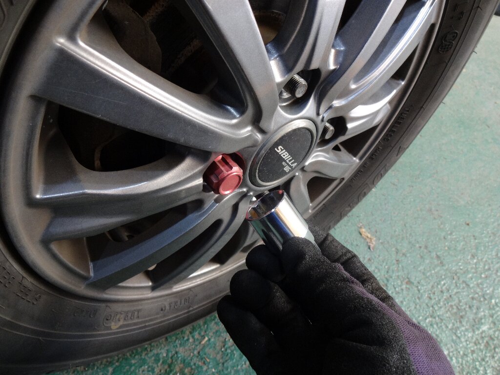 んでホイールナット外そうとしたら、1箇所ロックナットが入ってました。そもそもナットがアルミのアルマイト品だし、ロックも必要無いんで全部入れ替えちゃいます。