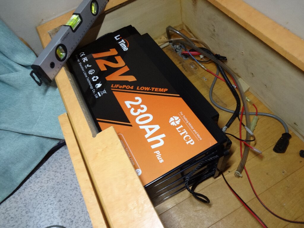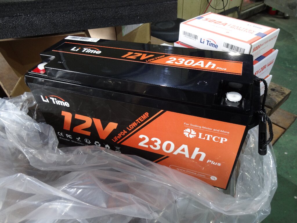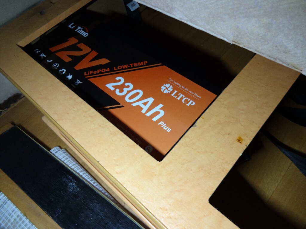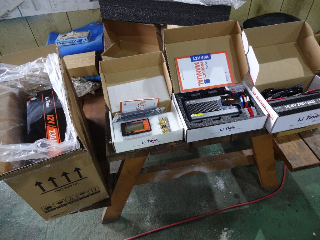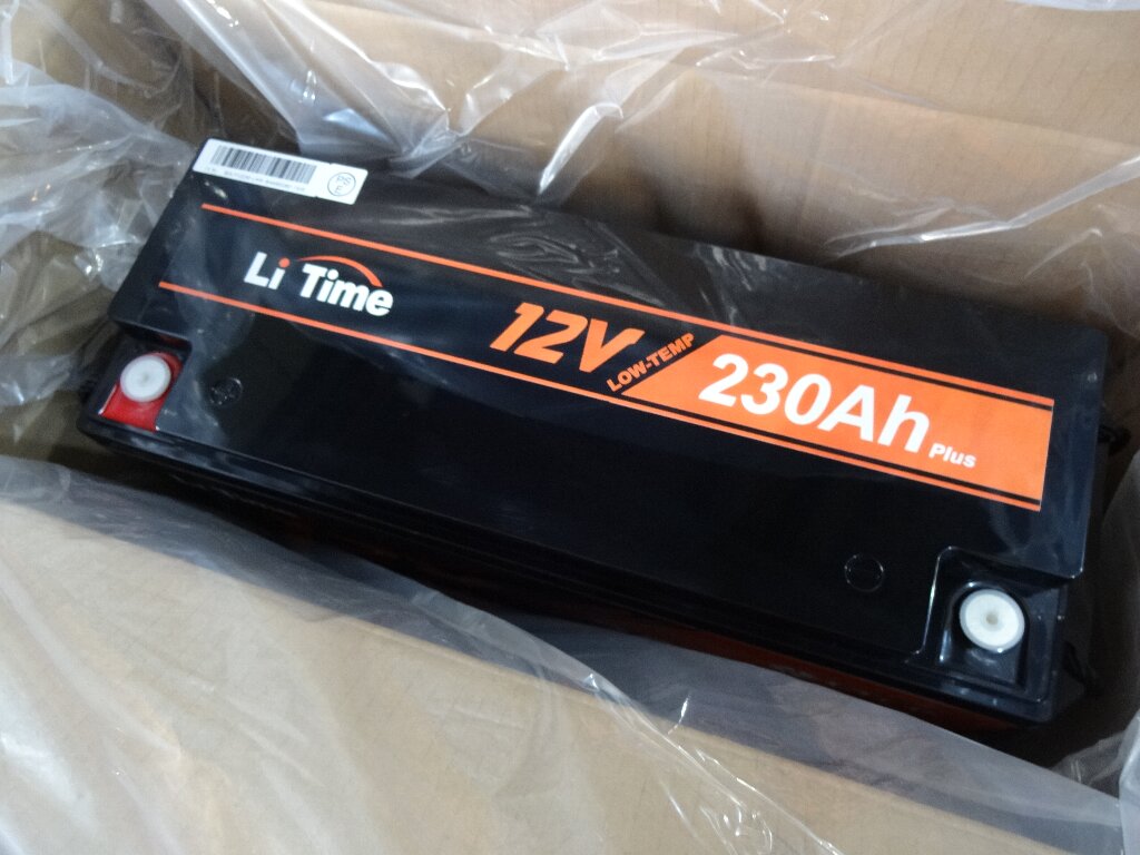 リン酸鉄リチウムイオンバッテリー(LiFePO4)12V230Ahです。複数バッテリー積んでバランス充電ってのも厄介なので、1本モノで200Ahクラス。しかも後ほどスグに恩恵を受ける事になるのですが、サイズ感が絶妙なので以前から目を付けてました。