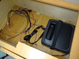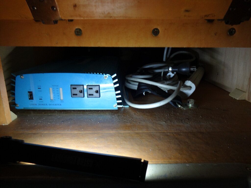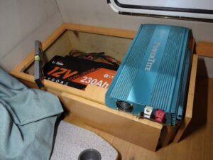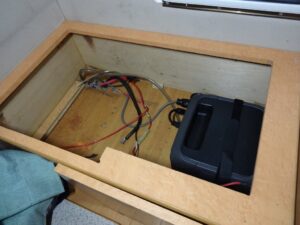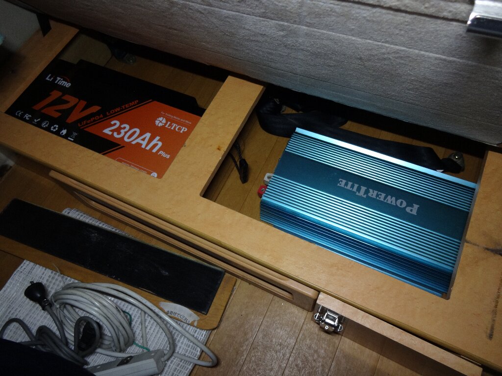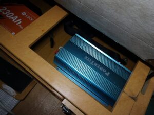 ただ、手持ちのインバーターを置こうと思ったらスペースがありません。前オーナーは100Ahのバッテリー2個と3000Wのインバーター置いてたので、インバーターはシート下の蓋に穴あけて顔出して設置されてました。