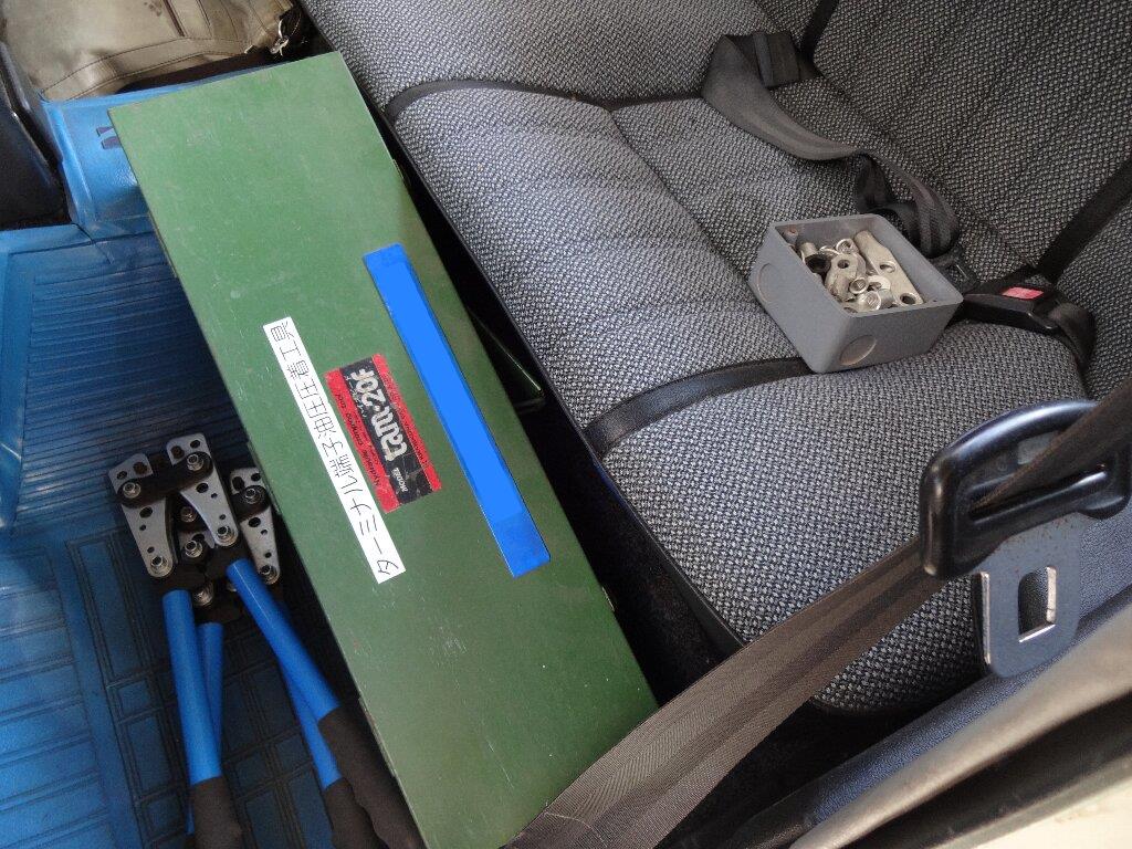 訪問の目的はコチラのカシメ工具です。先日お返ししに来たところなのに、またまた借りに来ました。ちなみに緑の箱には油圧のカシメ器が入ってます。コレなら38sqでも余裕でしょ。