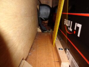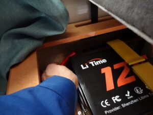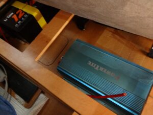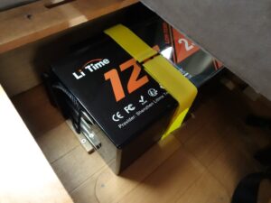 んで、昨日サブバッテリーを固定してから考えてたのですが、+(プラス)側にキルスイッチを入れる都合で、バッテリーの向きが車内側を向くと+(プラス)端子が車体後方に行き、インバーターとの接続は対角に繋ぐ必要があるので結構な距離が必要となります。また、+(プラス)配線のルートと-(マイナス)配線のルートも出来れば分けたかったので、バッテリーの端子が車体外側を向く様に置き直し、+(プラス)端子が前方に来る様に配置し直しました。