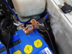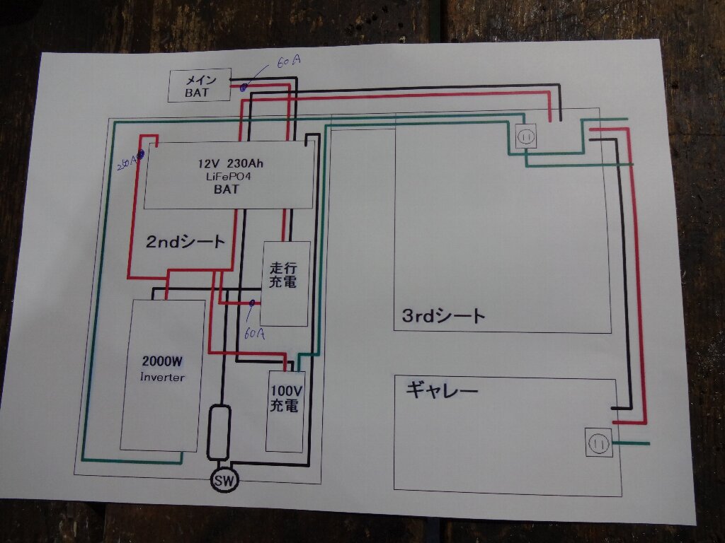 サブバッテリーシステムの構成図でマイナス側にカットオフスイッチを入れた配線図を印刷して持って来ました。