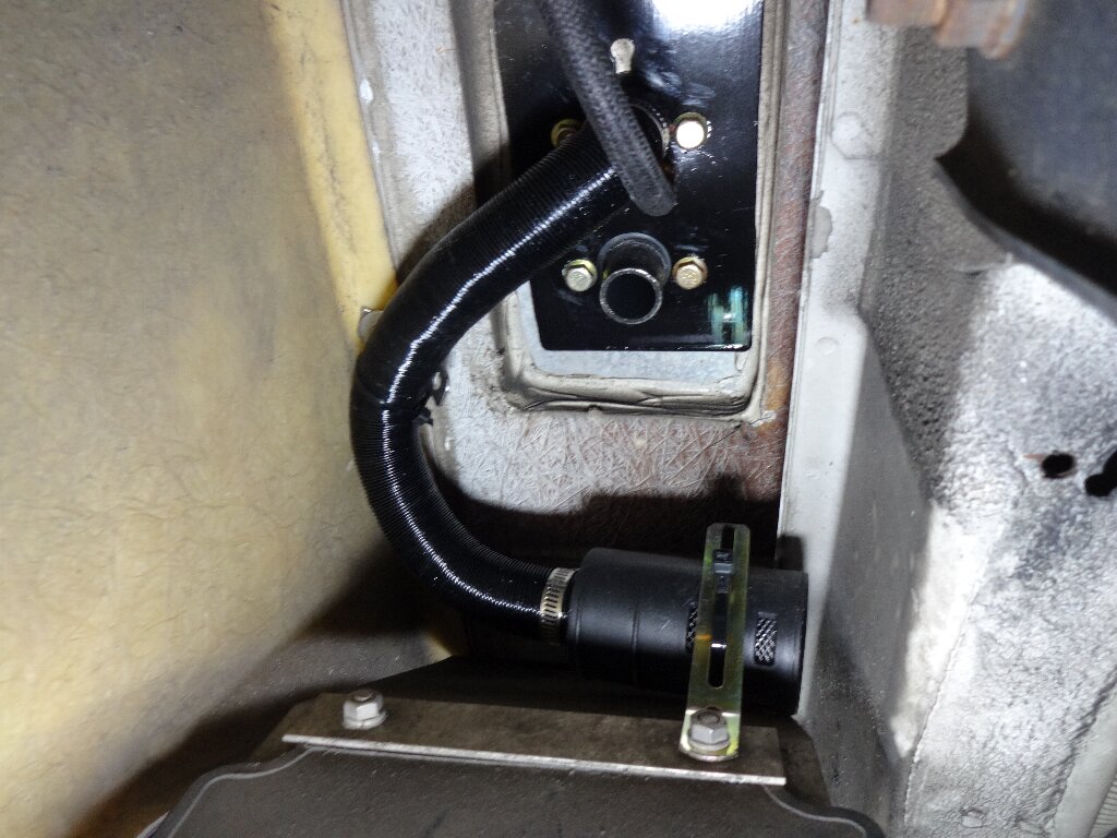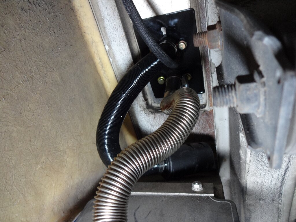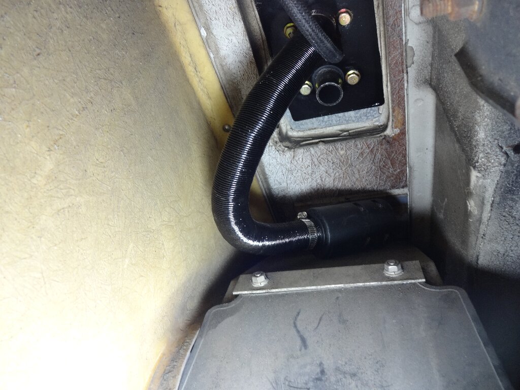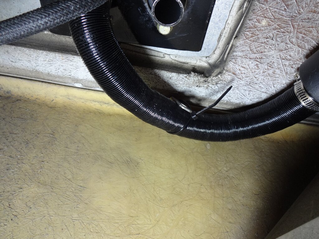 先端のフィルターはマッドフラップの固定ボルトを使ってステーを共締めし、そのステーにタイラップで留めました。