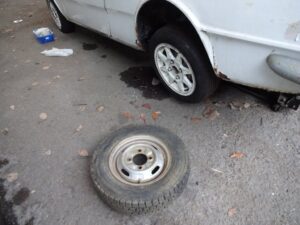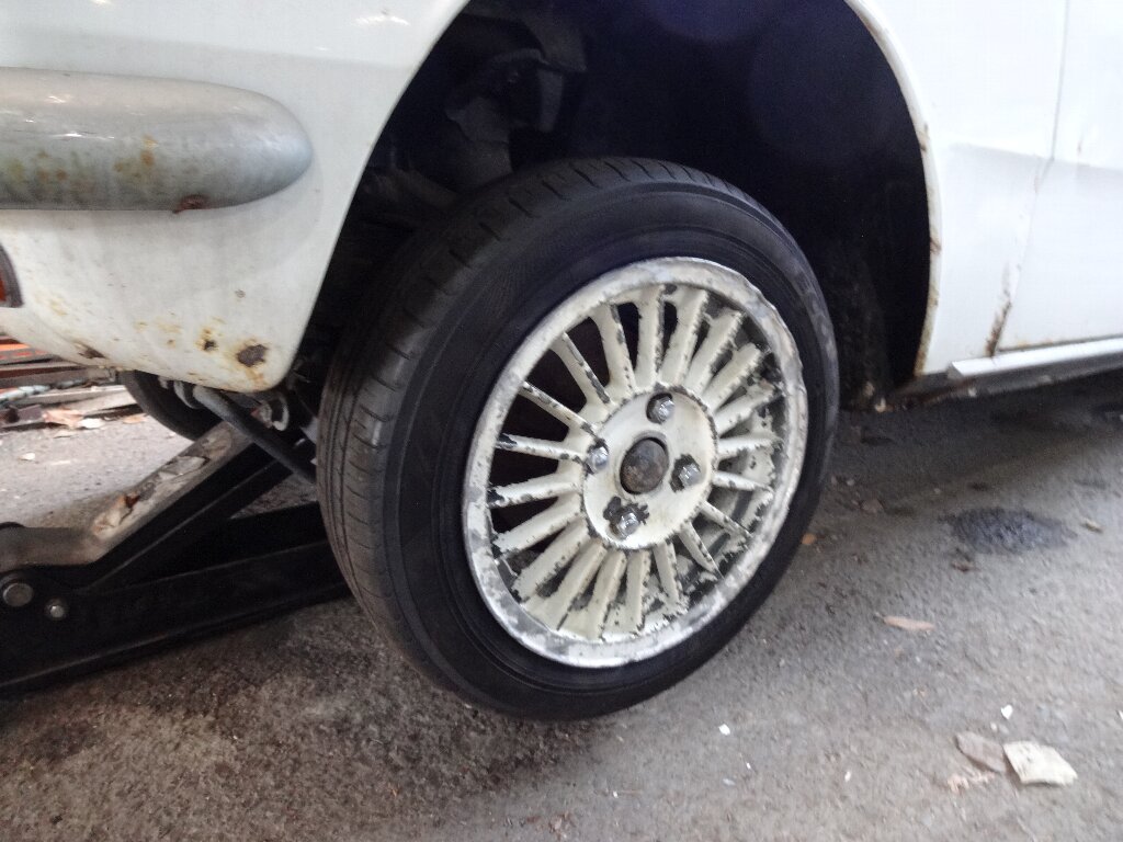 イキナリですがフロントをジャッキアップ。現在装着してたタイヤは転がし用のタイヤなので、手持ちのタイヤセットが入るか?確認しておきます。