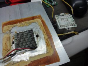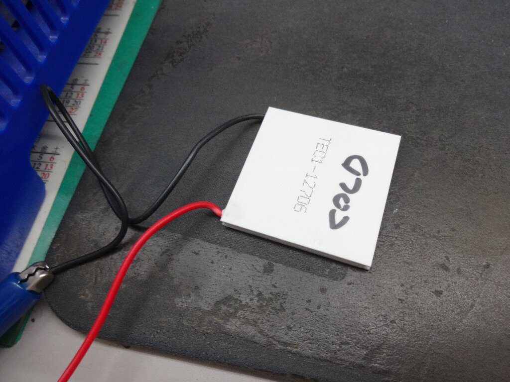 ペルチェ素子は電源通すと片面が冷え、片面が暖かくなるので、通電してどちらが冷える面なのか?マジックで書いときます。型番印刷されてる面が冷える面みたいです。