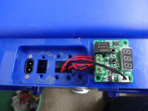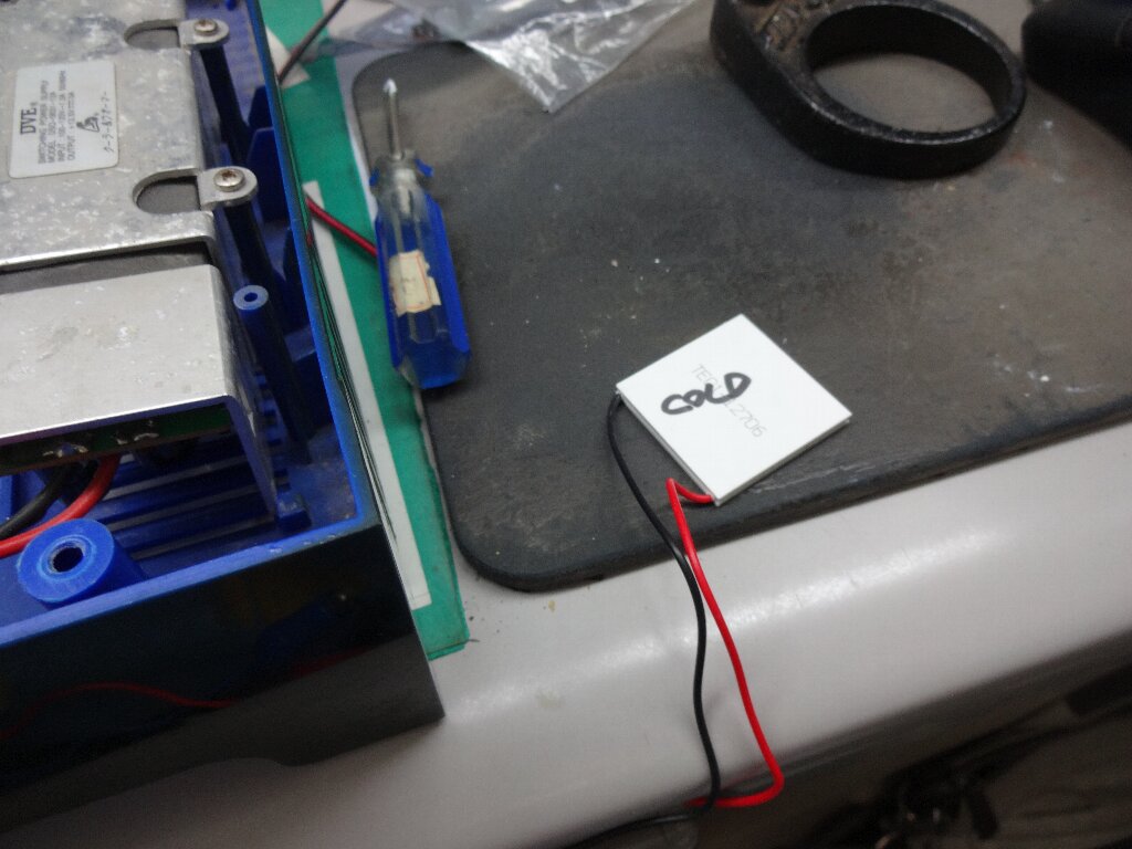 手前にあるのがペルチェ素子で、奥にあるのが温度センサースイッチです。元々素子直結の予定だったのですが、さすがにどこまで温度が上がるか分からないし、素子の寿命も縮め兼ねないので取り付ける事にしました。