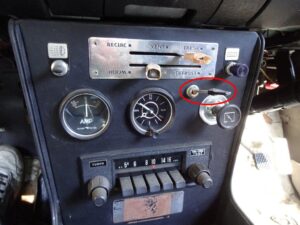 ようやく邪魔なシートベルト撤去し助手席に座ってセンターコンソール眺めてると、左側のアンメーターのところは元々シガライターがあったんですね。電圧計ならともかく電流計は不要だと思うのですが、、、つーかこんなところに大電流流れる配線は持って来たくないし。。。また、赤丸のボタンはトグルスイッチですが、自動で戻るタイプなのでパッシングかホーンだと思います。