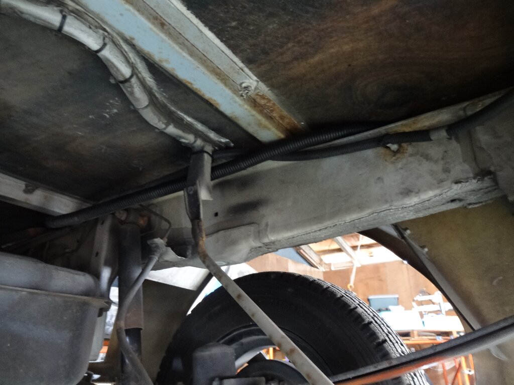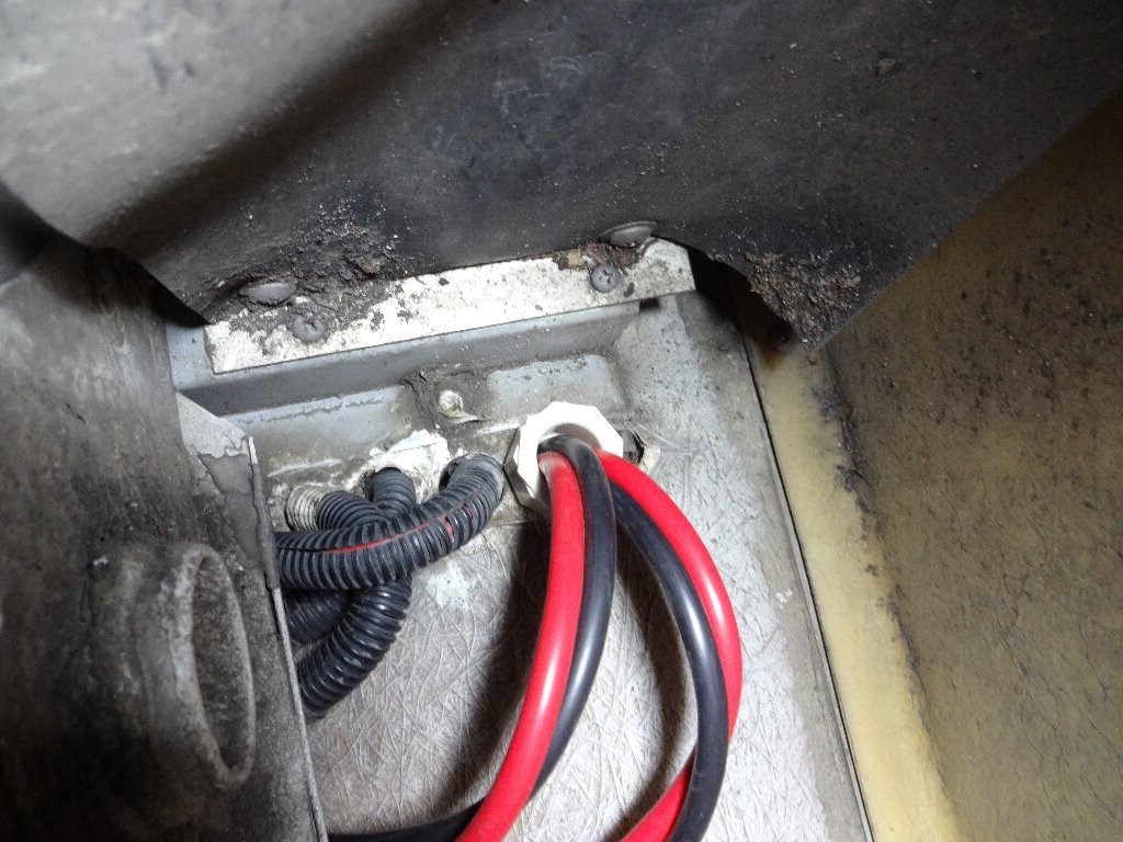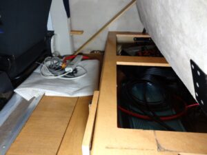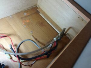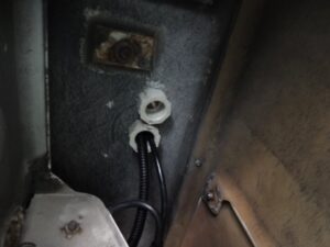 バッテリーから分岐して3rdシートやギャレー部分には14sqのケーブルを取り回すので、床に穴を追加して養生用のパイプをセットしました。