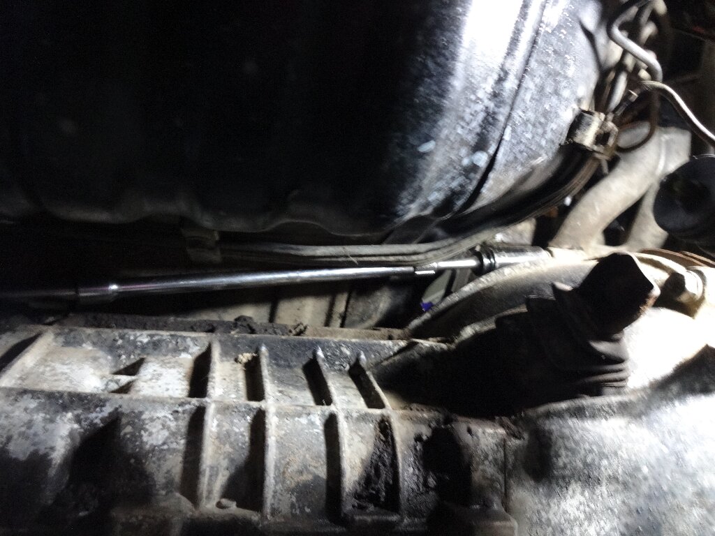 ミッションジャッキを下ろして後ろ下がりにして、隙間から超ロングになったソケットを挿し込み、
