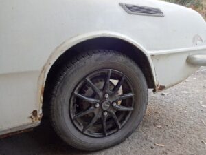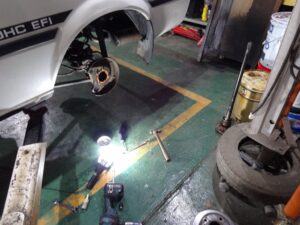結果、このフェンダーは加工して取り付けられたものであるという結論に達しました。オーバーフェンダーなど車検制度の厳しかった時代に、フェンダーに手お入れる事自体珍しく、全然疑って無かったのですが、前後に同じ幅のスペーサー入れたのに、後ろだけ妙に中に入ってしまうのも頷けました。