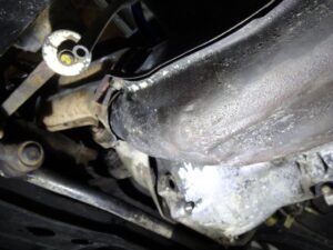 再度リフトを上げてエキマニとフロントパイプの接続ナットを本締めし、