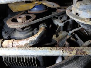 エンジン前方のパイプ類やプーリーは漏れなく錆びてます。