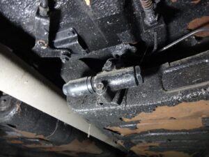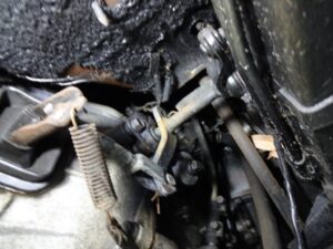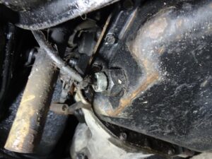 クラッチペダル下のリンク周りはそうでも無いのに、突如として油まみれになってます。