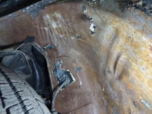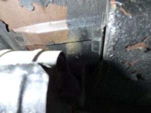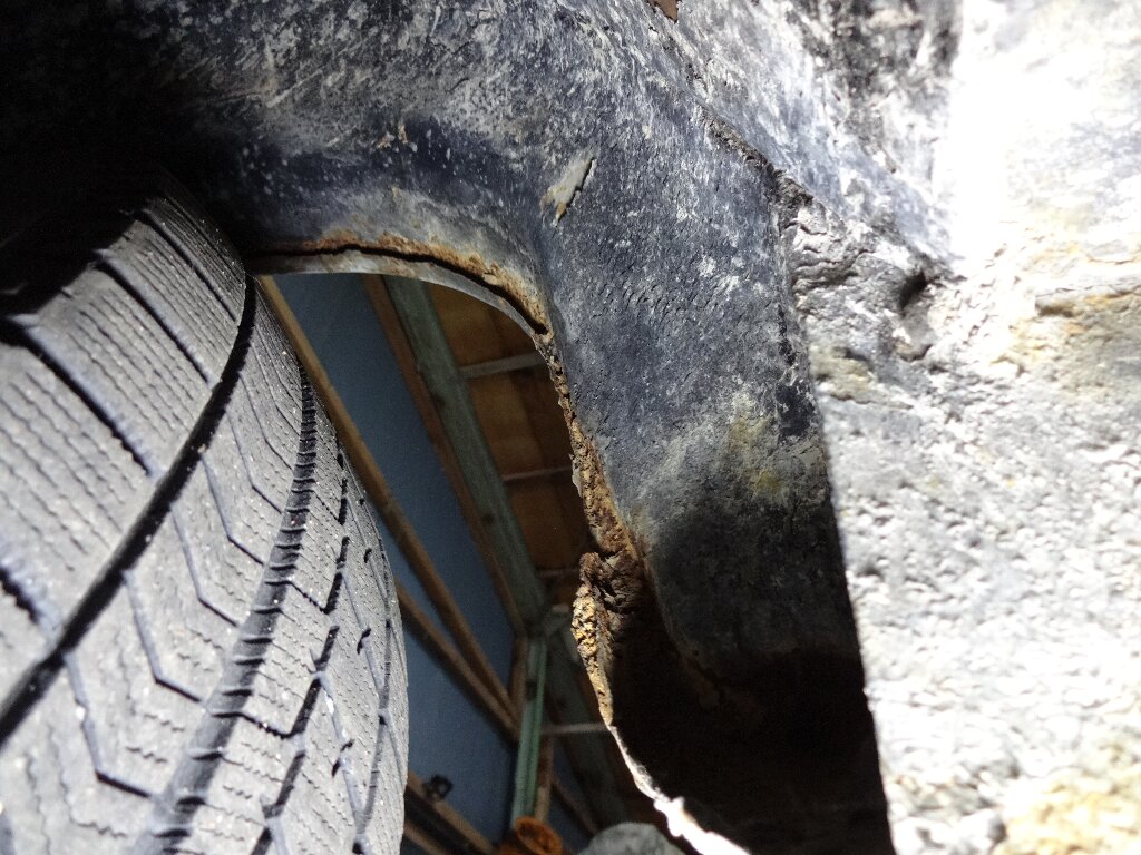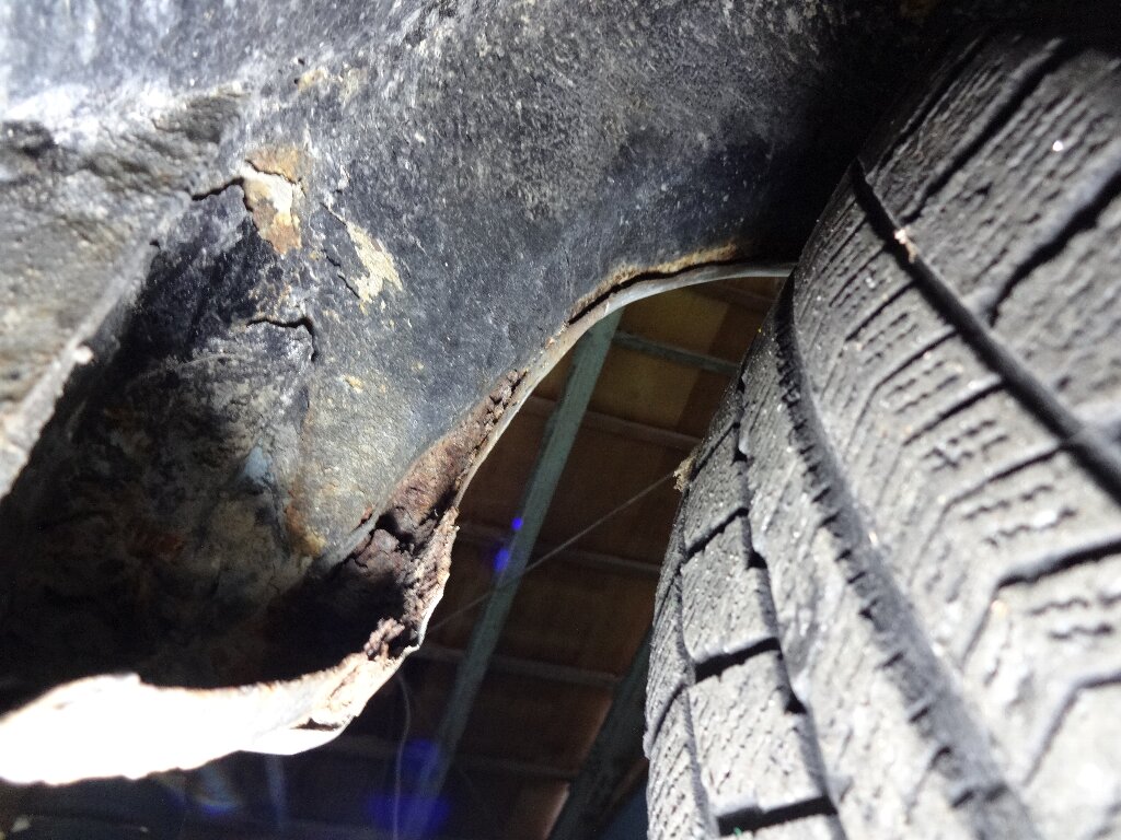 フロントフェンダー奥上部ですが、助手席側が腐り落ちてました。インナーフェンダーが無いせいで、自車が跳ね上げた水を直接被るんでしょね。。。