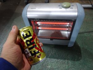 人間の方は既に限界なので電気ストーブと缶コーヒーで暖を取ります。アツアツの缶コーヒーは至福ですが、出してスグはずっと握ってられないぐらい熱いです。