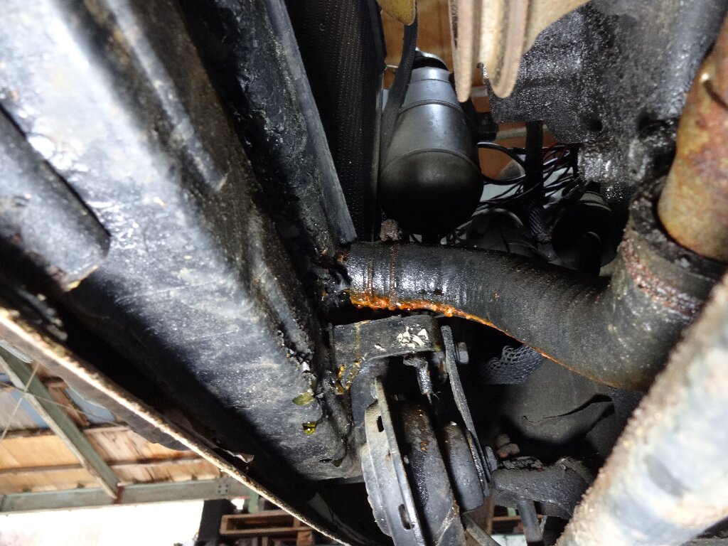 下から見ると、ロアホースのラジエター挿し込み部からの水漏れが顕著なので、ラジエター外す事にしました。