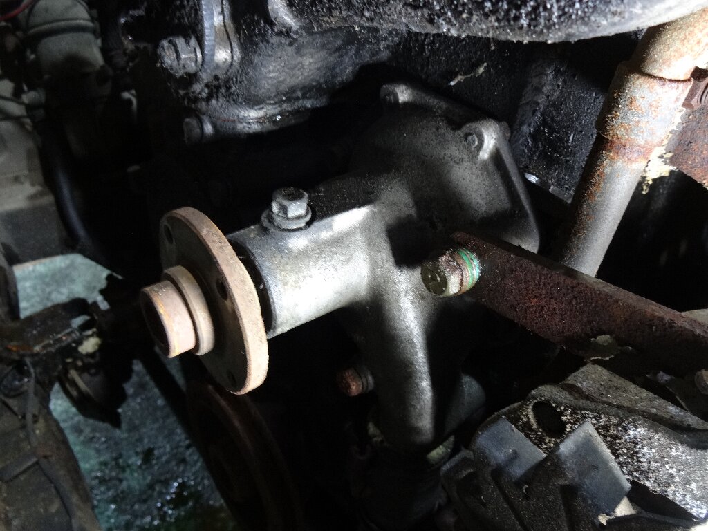 そしてファンとプーリー外してようやくウォーターポンプに辿り着きました。コイツを外して固着を剥がす、もしくは交換するのが最終目的なんです。