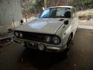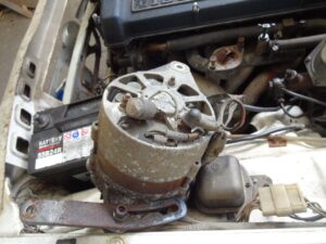 邪魔になるオルタネーターも外してしまいます。外付けのボルテージレギュレターが付いてるタイプなので、71スプリンターと同じ様に、今時のオルタネーターにでも交換してやりたいところです。
