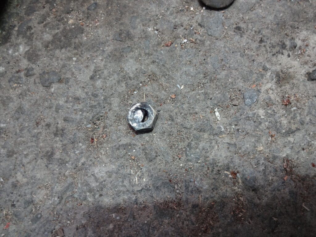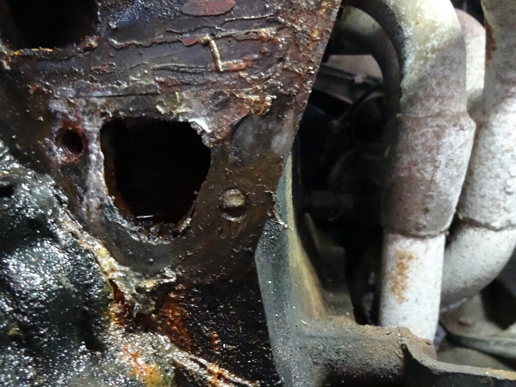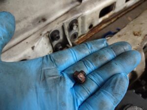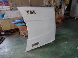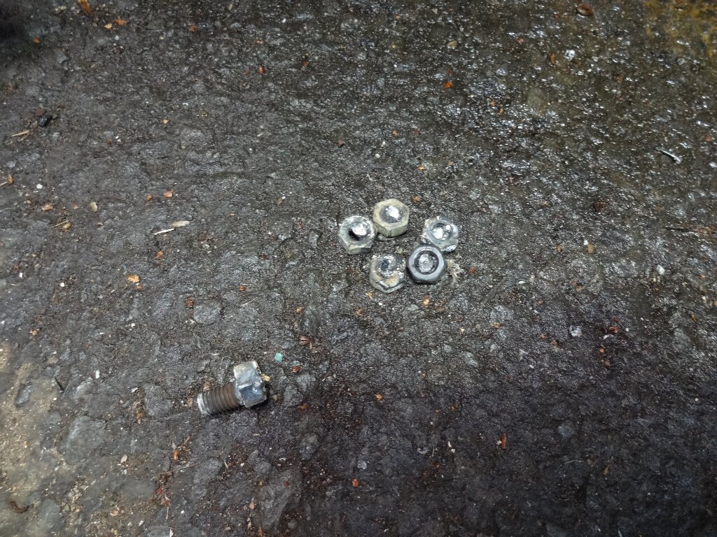 引き続き邪魔になりそうなボンネットも取り外します。イキナリボルトが一箇所折れましたが、折れた断面見ると、どうも元々折れかけてたみたいです。