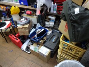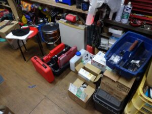 カゴを下ろして来るにはこの辺り片付けないと、、、バラしたソレックスもいい加減に片付けないと部品無くしそうです。