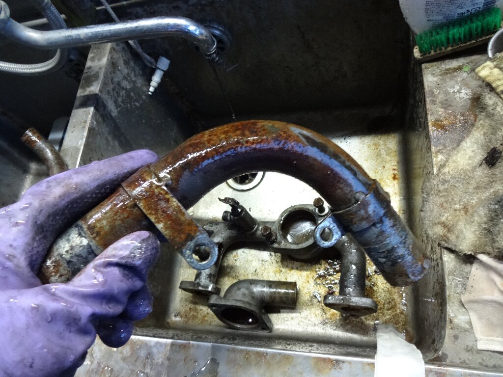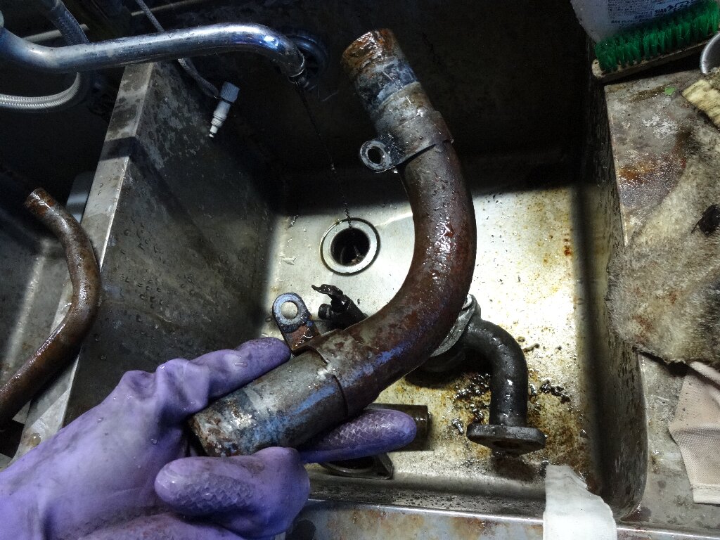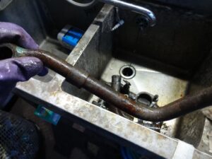 ホースを外した金属パイプとバンド類はスプリンターのガソリンタンクの錆取りに使った溶液に浸け込んでおきます。