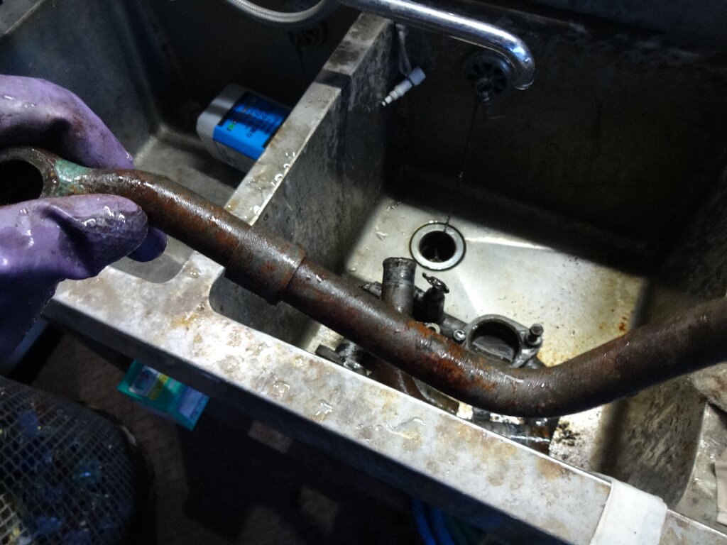 パイプの中に錆が溜まってたので、ドライバーで穿ってから、先ほどのバケツに浸け込みました。