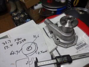 ウォーターポンプの軸部分が31.6ミリ、外径68.7ミリなので、内径32ミリ、外径69ミリ、厚さ8.5ミリのスペーサー作れば大丈夫そうです。ミスミあたりで作って貰えるのかな?ちと調べてみるとしましょう。