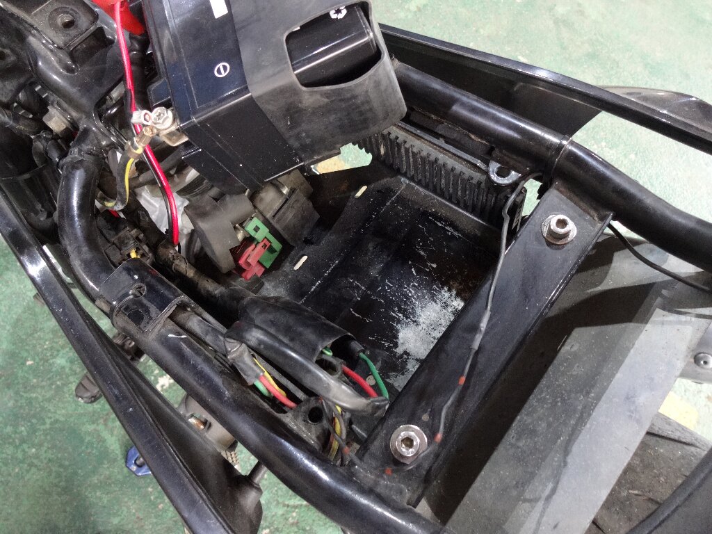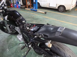 ウィンカーケーブルがどうなってるのか?確認すると、かなり延長されてバッテリー横の部分でギボシ接続されてました。ソレにしても丁寧なシゴトされてます。