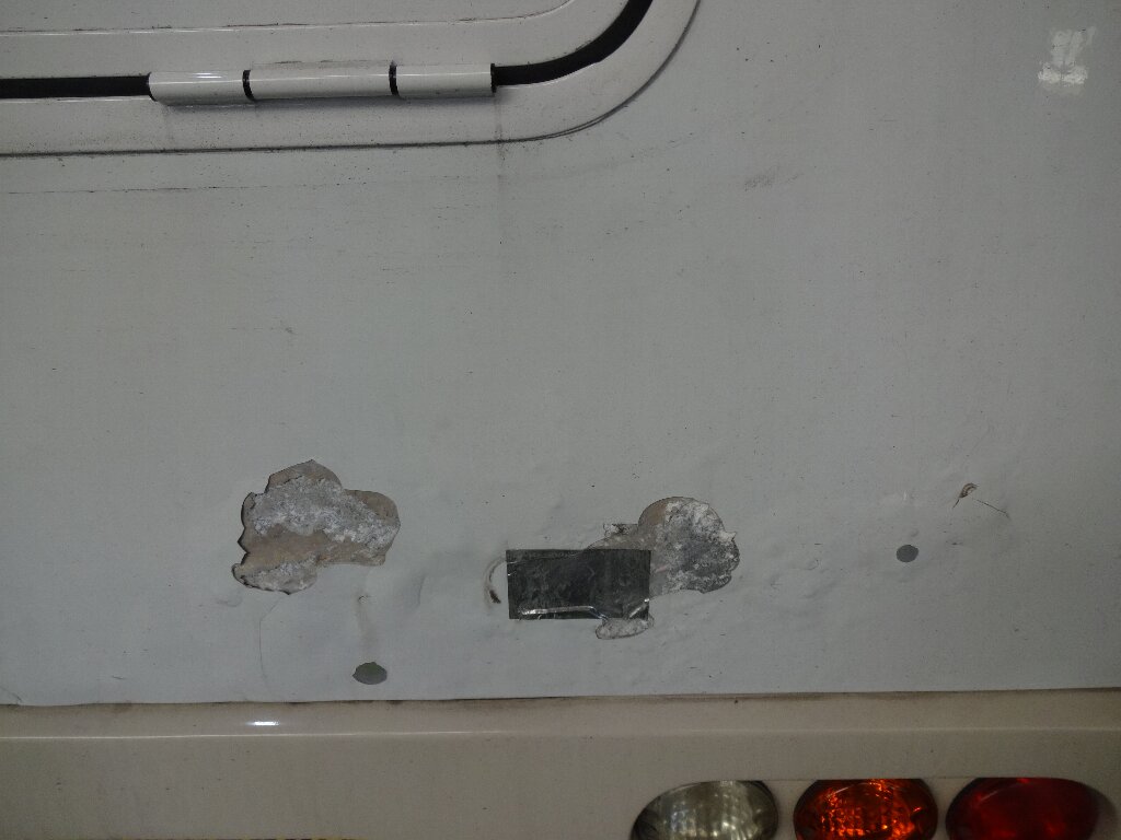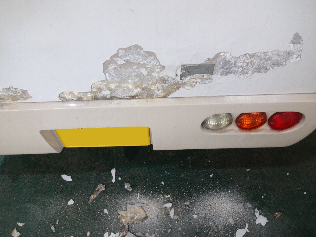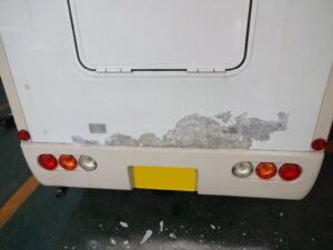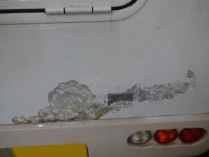 恐らく外板のアルミ複合板の内側で錆が発生して塗装を押してるって事だと思うのですが、こればっかりは剥がして補修しないとどうにもなりません。