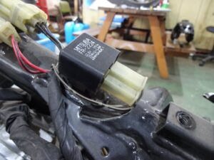 ウィンカーリレーは2端子のタイプ。LEDウィンカーに交換する際、このリレーを対応品に交換すればハイフラ対策になるかと思います。