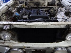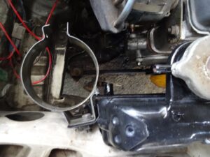ラジエターは上下左右の4箇所で留まってます。縦目ベンツはゴムブッシュのみでのマウントでしたが、こんなのでよく振動に耐えれるんですね。