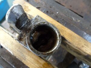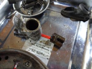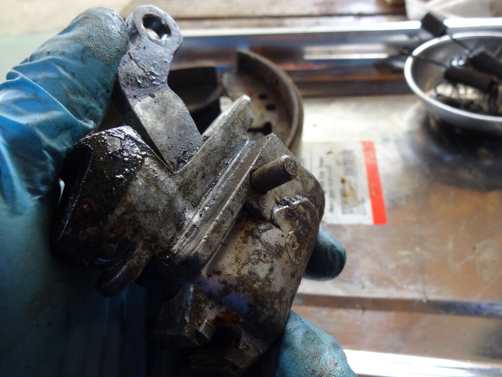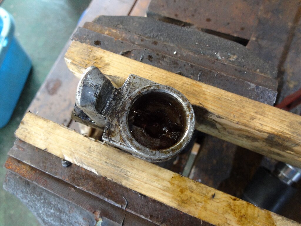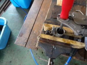 さて、このメリ込んだピストンをどうやって引き抜こうか?思案します。よくあるホイールシリンダーは両側にピストン付いてるんで、片側から押せば抜けるのですが、このホイールシリンダーは片側ピストンなので押せないのよね、、、