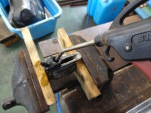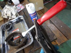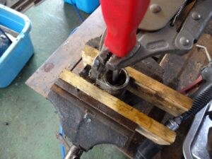 万力で固定したホイールシリンダーをコジります。